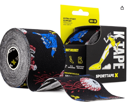 Muscle Tape – Kinesiology Tape is designed to reduce the pressure on pain receptors in the skin; providing support and strapping to fatigued or injured muscle. The aim is to try and support the taped area, without being restrictive – meaning you can keep moving.