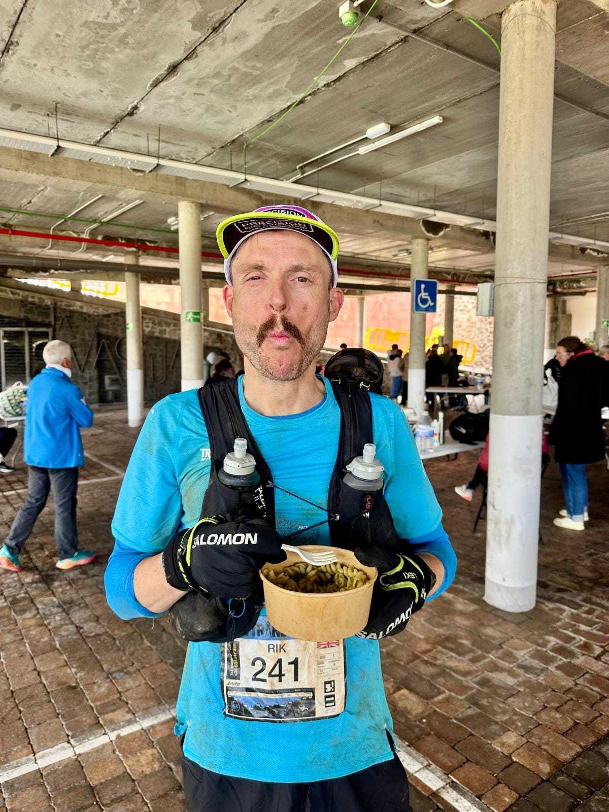 The trail to the next aid station, Artenara (67km), involved another 1200m of climbing through the rocky, muddy mountain trails. My body was feeling pretty good up until this stage. I was still maintaining good calorie and fluid intake and was managing my layers and body temperature pretty well. I was still able to run everything apart from the longer, steeper ups too and maintained my position in the field pretty well. This was until the final, quad-punishing descent into Artenara. We dropped almost 500m straight down on a mix of rock, concrete and tarmac and by the time I arrived at the checkpoint my legs felt cooked and I could feel the start of my infamous side stitch which has haunted my races for the last few years. I was also feeling pretty tired, a combination of the midnight start messing up my circadian rhythm and the relentlessness of the course. Resisting the urge to sit down, Liv encouraged me to shovel down some pesto pasta, salted rice and electrolyte tabs before jog walking our way towards the exit. Liv informed me that race-favourite Tom Evans had dropped here due to the cold which was pretty shocking and was testament to how poor the conditions had been.