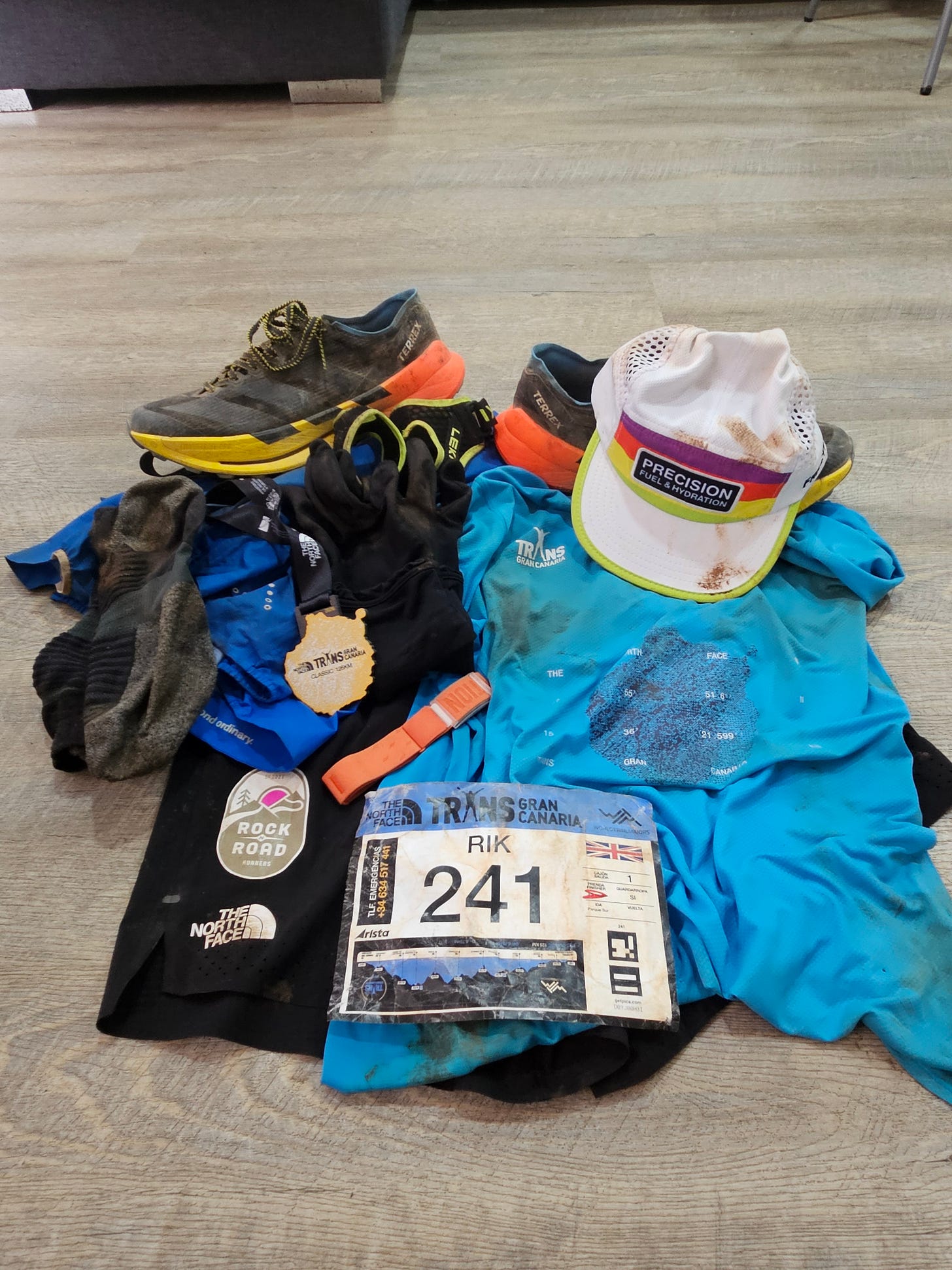 I had a solid, albeit truncated, 8-week training block leading in, details of which I’ll dive into in more granular detail via a different article. I’d logged tens of thousands of metres of vertical gain and big volume weeks whilst maintaing trauning quality in the form of long tempos and threshold work. Strength training had remained really consistent and I’d dialled in my nutrition – Precision Fuel 90g gels for the win. Due to some ongoing shin pain, I hadn’t been able to focus on the specific hard downhill sessions required for a race of this elevation change so if there was going to be any issues, it would probably be my quads exploding a la UTMB 2024. I also had some concerns about the state of the trails and temperature changes on Gran Canaria. The weather seems to vary a lot and heavy rains turn the hard-packed dirt into a muddy slip n’ slide and various microclimates can push the temperature close to zero, especially higher up the mountain. Shoe and gear selection would be key so I brought my racing shoes and a more minimal pair of mud shoes just in case along with a range of warm layering systems.